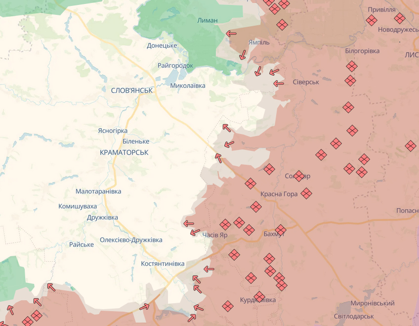 Auch den Zangenangriff auf Raj-Oleksandrivka, den letzten großen Knotenpunkt der ukrainischen Verteidigung östlich von Slovjans’k, setzen die Besatzungstruppen fort – von Norden entlang des Sivers’kyj Donec, von Osten aus Richtung Sivers’k und von Süden entlang der Überlandstraße Bachmut-Slovjans’k.